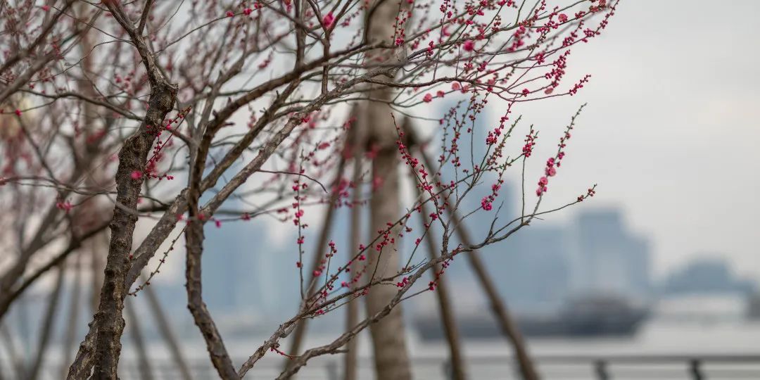 在西岸滨江,满缀枝头的梅花盛放,一朵朵,一簇簇,一丛丛,妖娆娇俏,错落有致,点缀在各处,成为滨江一道靓丽的风景线。