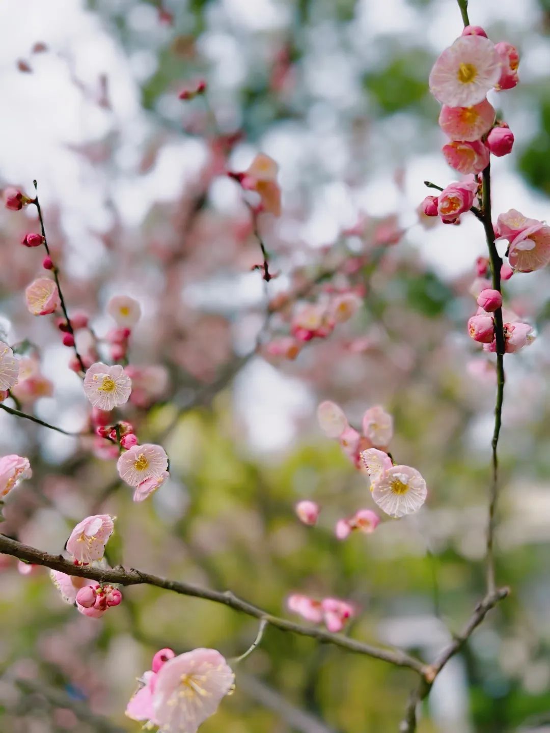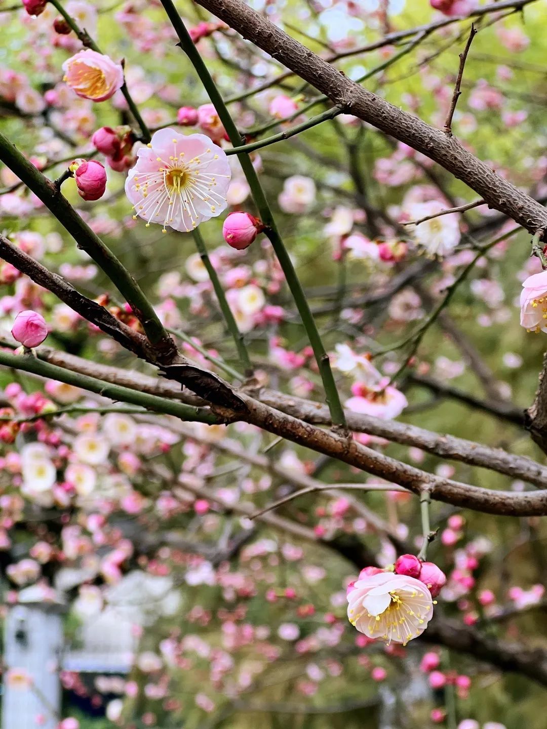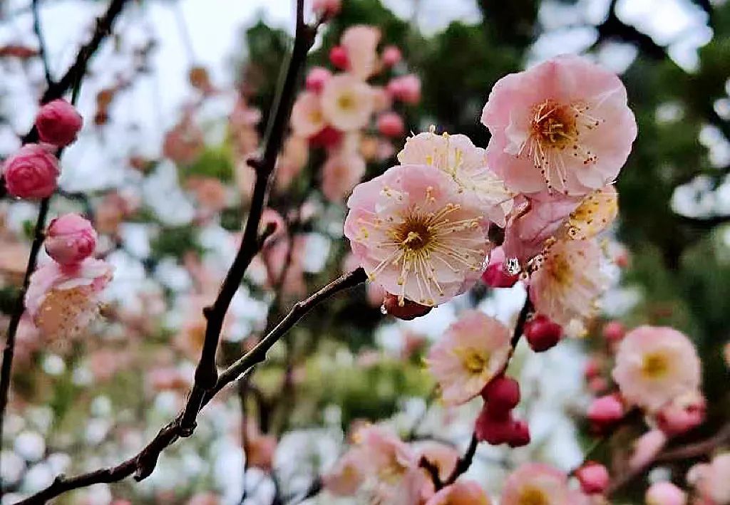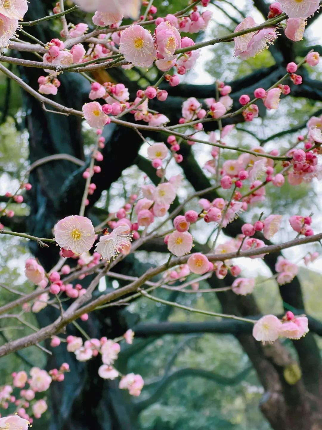 走进漕溪公园,梅树夹道、光影斑驳,宫粉梅和绿萼梅色彩如锦,浓淡相宜,那层层叠叠的梅花,度过了冬的严寒,迎面而来,堆砌出无限优雅。