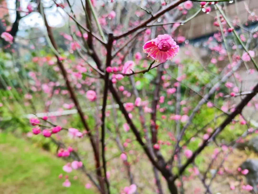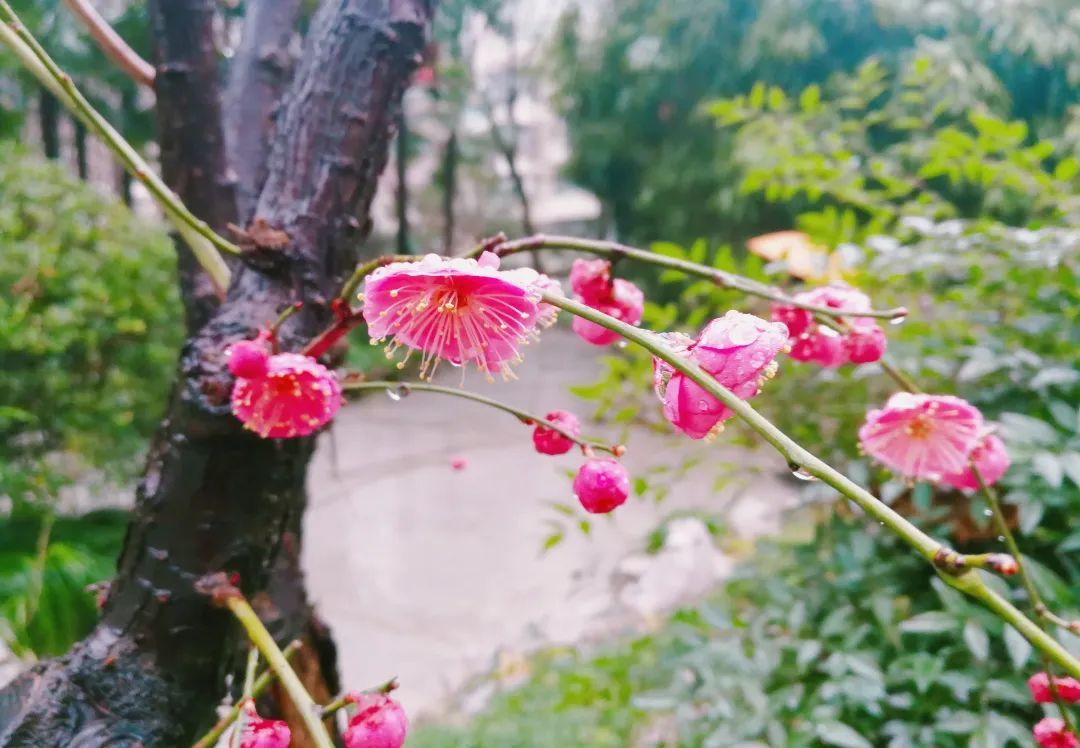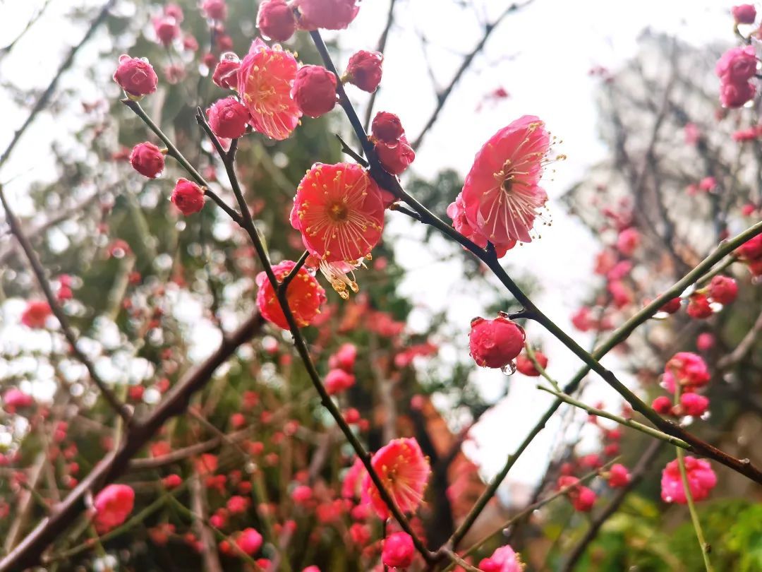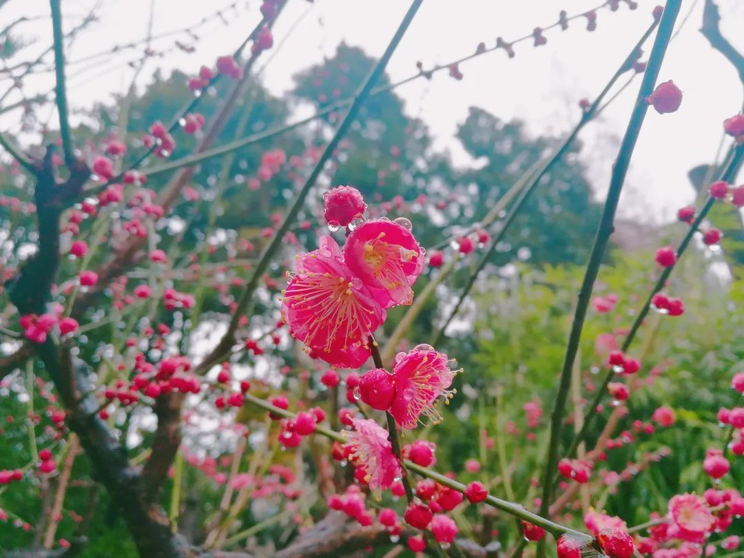 “春雨梅花色更娇,含珠滴露似琼瑶”。绵绵的春雨,无声落在梅花上,花间枝头蒙着一层细细的薄雾,在雨珠的衬托下,梅花显得更加娇艳醉人。