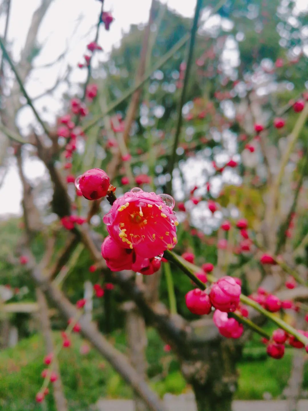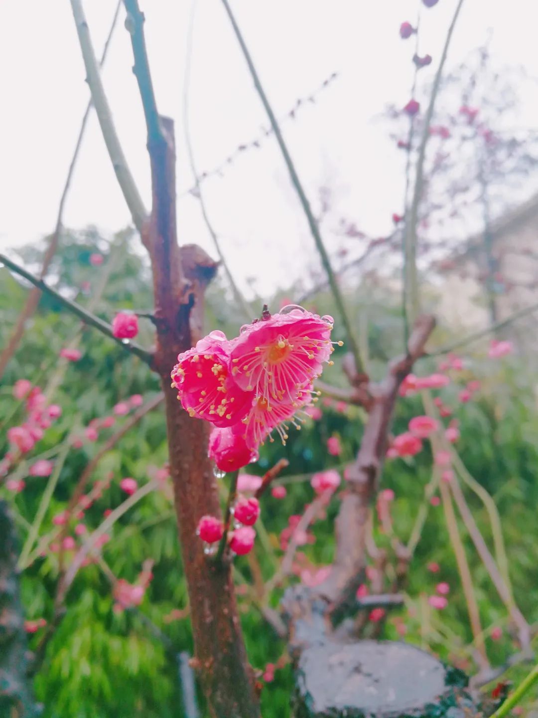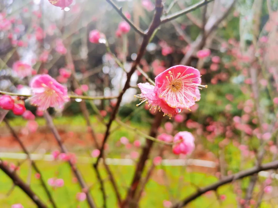 “春雨梅花色更娇,含珠滴露似琼瑶”。绵绵的春雨,无声落在梅花上,花间枝头蒙着一层细细的薄雾,在雨珠的衬托下,梅花显得更加娇艳醉人。