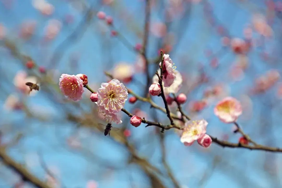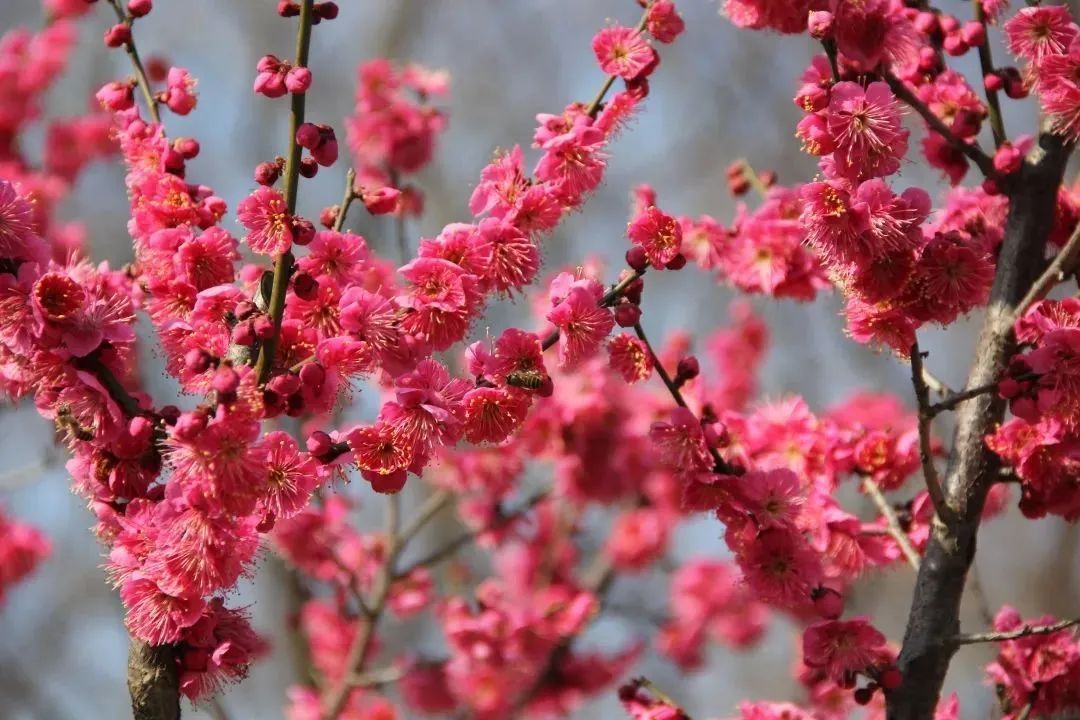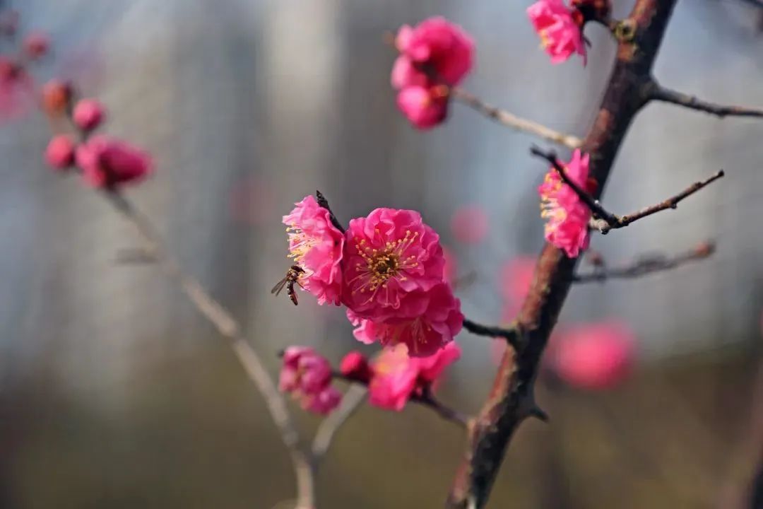 徐家汇公园一树树梅花映入眼帘,深红的、粉红的花朵密密匝匝挤满枝头,微风拂过,梅香四溢,引得不少小蜜蜂流连忘返。