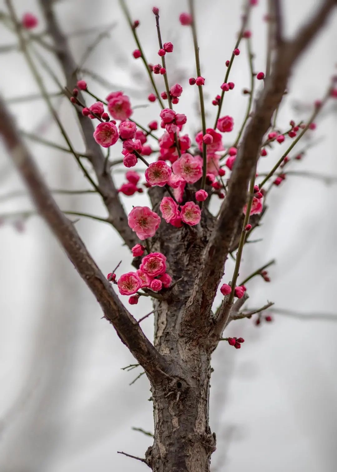 您瞧,这株“大杯”梅,玫红色的花朵挤满了枝头,簇拥在一起。艳如朝霞,十分吸睛。走近一看,花苞已完全打开,在寒风中傲然绽放。