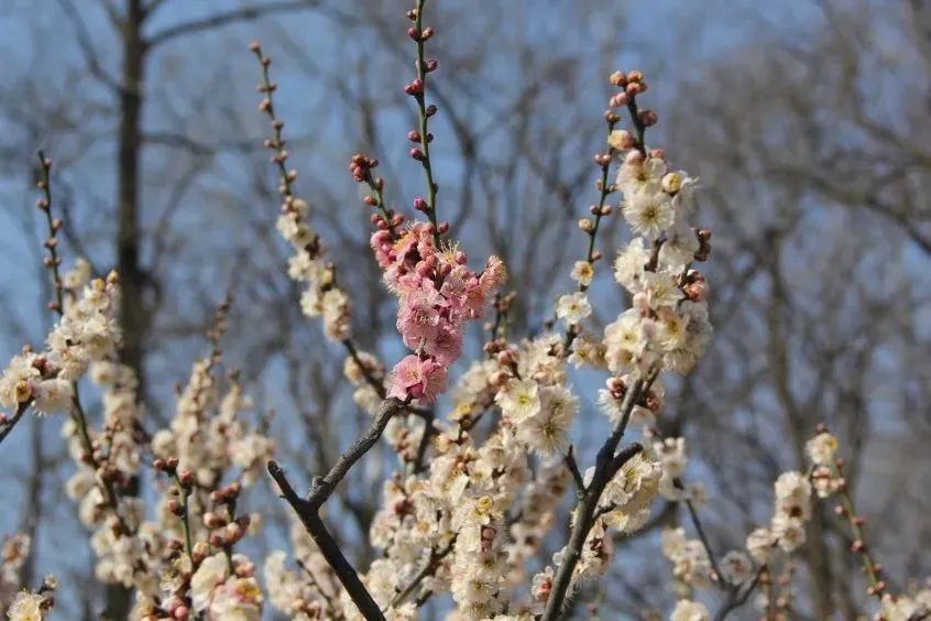 这株“单瓣跳枝”梅十分与众不同,其他梅花品种开的花朵都是一种颜色,它的花瓣颜色竟有两种。整株梅花以白色为主,却有少数枝头开的是淡紫红色,让人啧啧称奇。