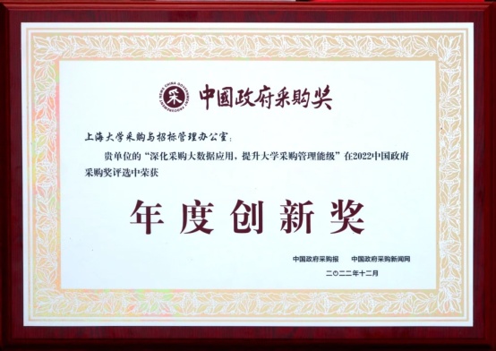 上海大学智能采购系统通过全景式的采购监控、采购异常智能警示及分析、追溯查询,将学校采购工作的监督管理变被动为主动,数字化赋能采购治理的上大经验示范效应得到高度认可,学校在2022年中国政府采购峰会上荣获“中国政府采购奖·年度创新奖”。