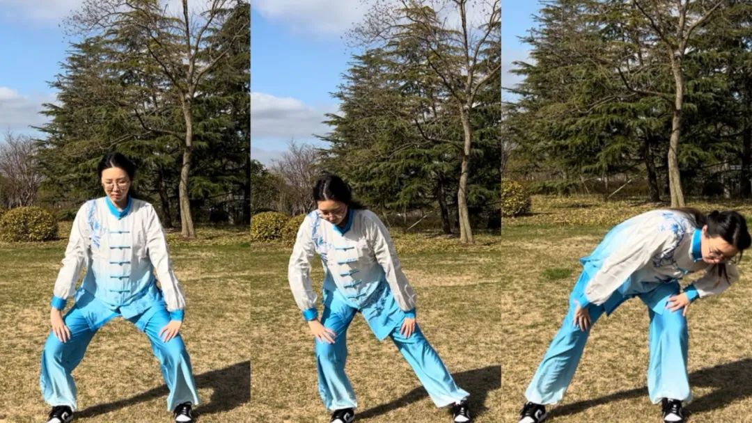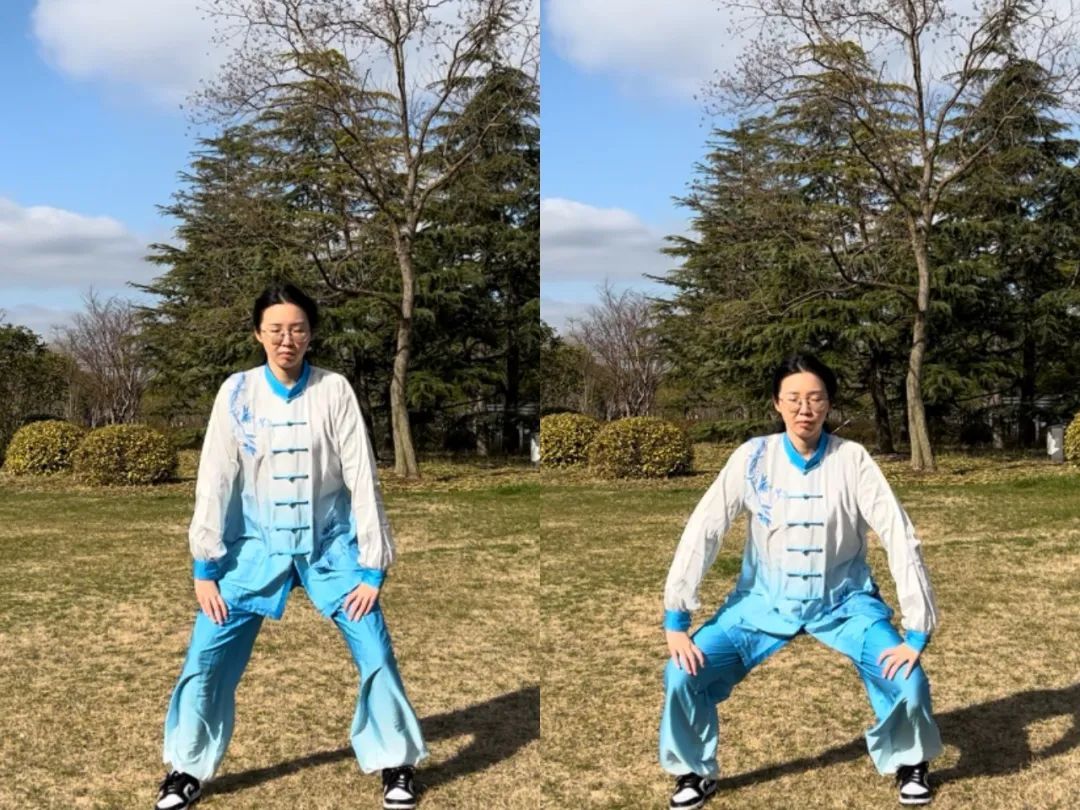 3、合:上半身立起回正,随之下颏微收;左胯往中收,使重心落于两腿中间,回到骑马桩,重心略坐,目视前下方。