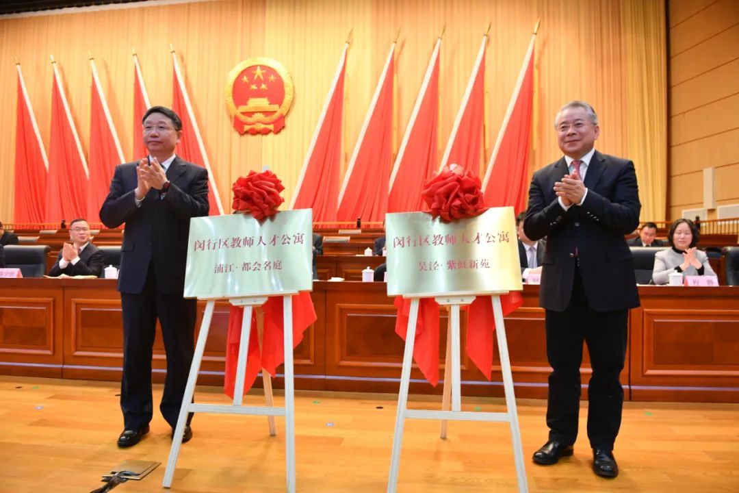 闵行区人大常委会主任王观宝、闵行区政协主席祝学军为闵行教师人才公寓揭牌