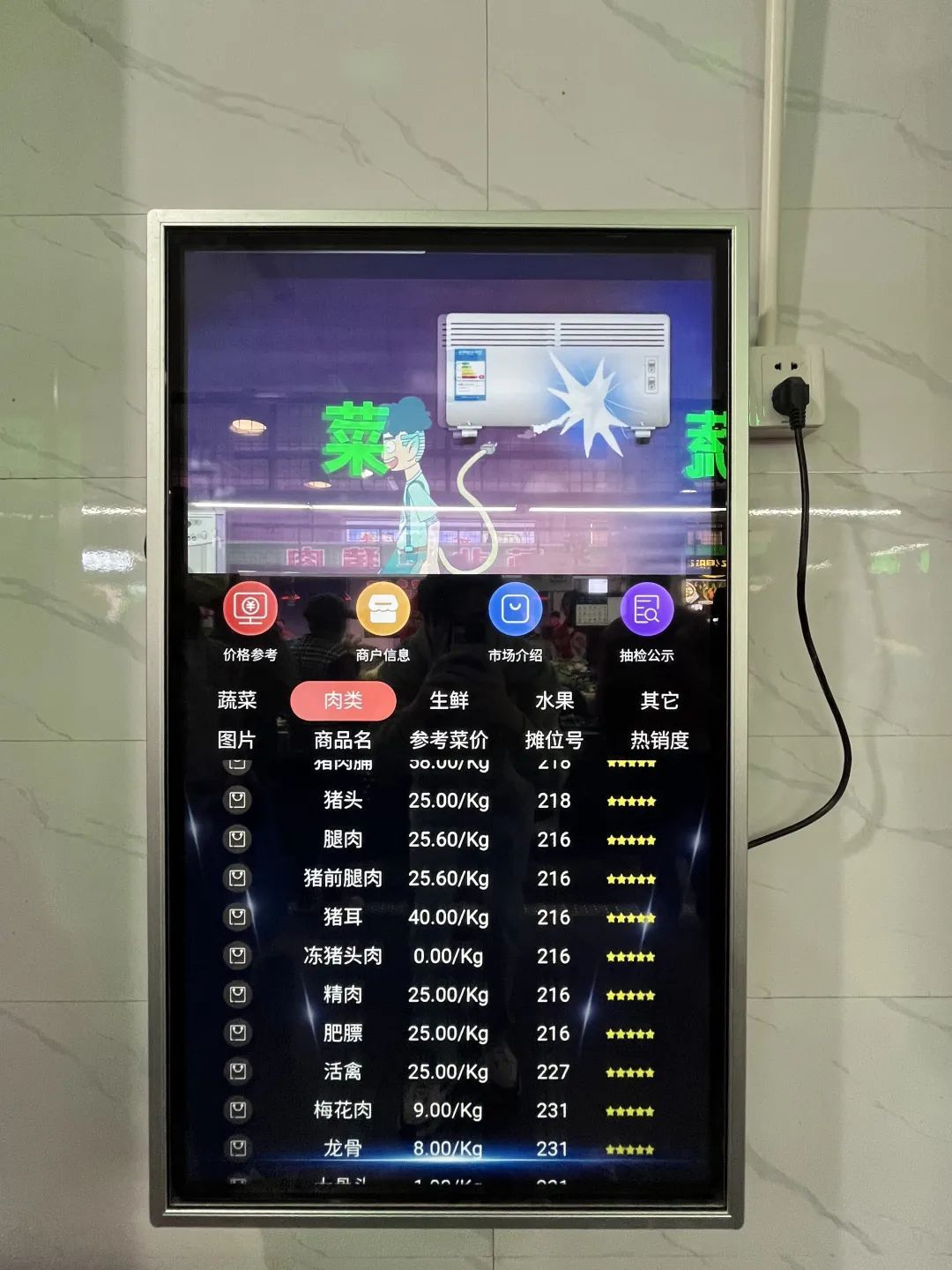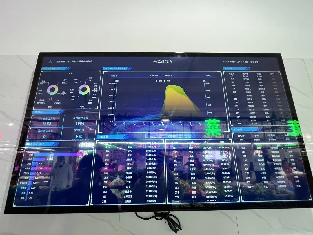 只见菜市场大厅墙壁上悬挂着彩色液晶大屏,大屏上清晰地展示着商户列表、交易信息、指导菜价、当日检测和客流量等信息,让人一目了然。据菜市场工作人员所述,每个摊位的电子秤都与显示屏秤屏联动、数据共享,每一件过秤的商品,称量的结果都会实时展示在显示屏上,详细记录菜场中发生的每一笔交易,让市场内的消费全过程公开、公平、公正。