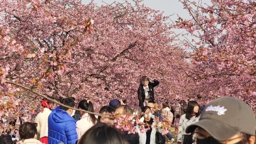 有人将梯子架在辰山植物园樱花大道中间拍照,一定程度上影响到其他游客通行。(图源:上观新闻)