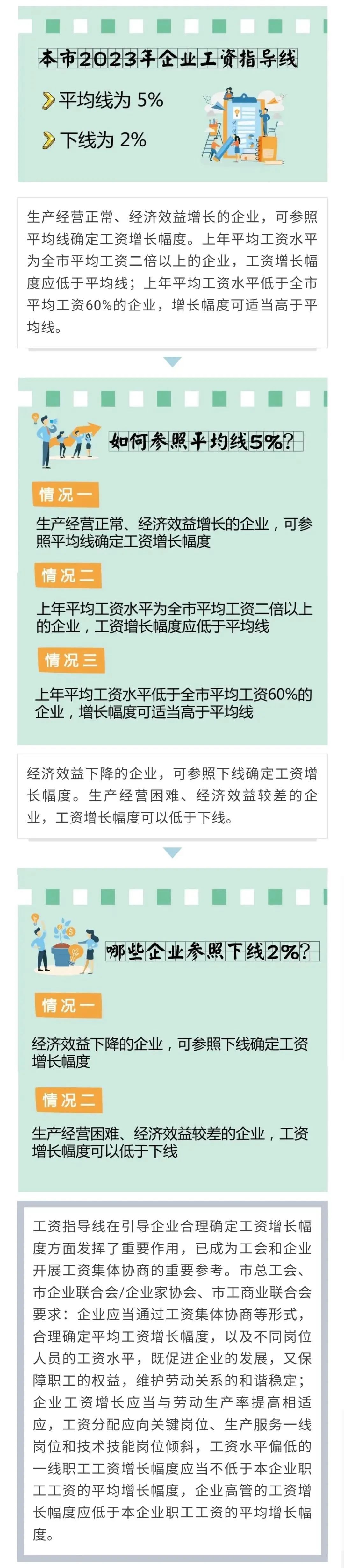 市人社局介绍,为引导企业职工工资合理增长,并为企业和职工开展工资集体协商提供依据,经市劳动关系三方共同研究,市总工会、市企业联合会/企业家协会、市工商业联合会联合发布了上海2023年企业工资指导线:平均线为5%,下线为2%。工资指导线有什么作用?如何参照平均线5%?哪些企业参照下线2%?详见↓