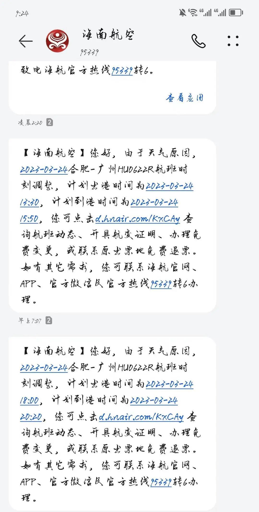 据小刘提供的机票及延误短信显示,他从合肥新桥机场出发至广州白云机场的航班,在3月23日被多次提示延误。“早上先是从9点延误到10点,后来又延误到下午3点,后来说是5点,最后一直陆陆续续延误到晚上12点后取消了。我当时也查过去广州的其他方式,但几乎所有方案都来不及。”