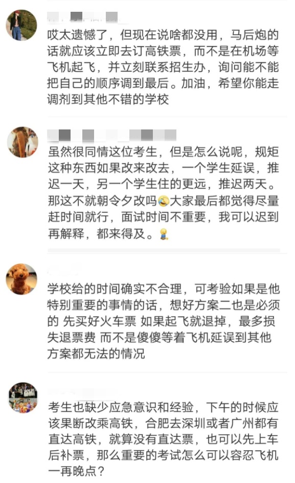 该考生介绍,自己在22日看到复试消息后,便购买了23日的飞机,但因为天气原因航班延误,他只好无奈在机场一边做复试准备,一边等起飞。直到夜里航班仍未能起飞,该考生意识到已无法及时赶往复试,便在网上分享了这一经历。