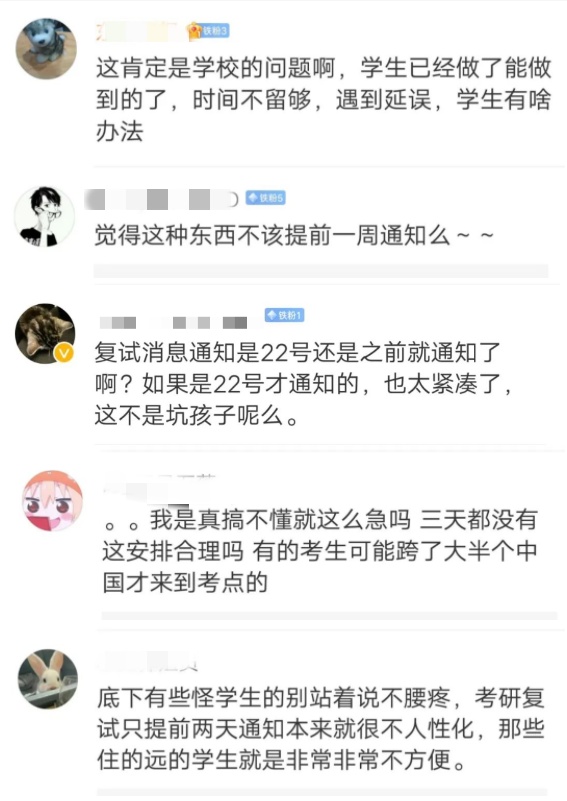 针对此次事件,教育学者熊丙奇认为,尽管教育部等官方机构并未对学校发布复试通知的时间作出具体要求,但从更人性化、也更科学的角度看,学校需要从考生角度出发,为考生留下充足的赶考时间。至少提前5天或一周告诉考生复试时间,或许应成为一条基本要求。