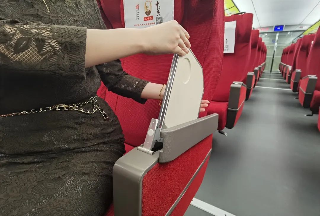 商务座茶桌板,在右侧手臂扶手内哦!打开、取出即可使用。