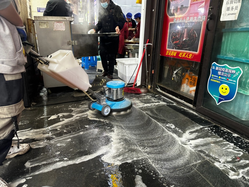 一名工作的保洁员称,现在地上的油渍会用专门机器清洗,“等他们收摊以后再洗”。据其介绍,夜市一些摊位要到半夜12点收摊,他和五六个保洁员每天要清理场地。保洁公司对保洁员的要求是,每人负责夜市的一片区域,有的捡垃圾,有的倒垃圾桶,大家有序分工,在第二天夜市开之前,保证良好的卫生面貌。