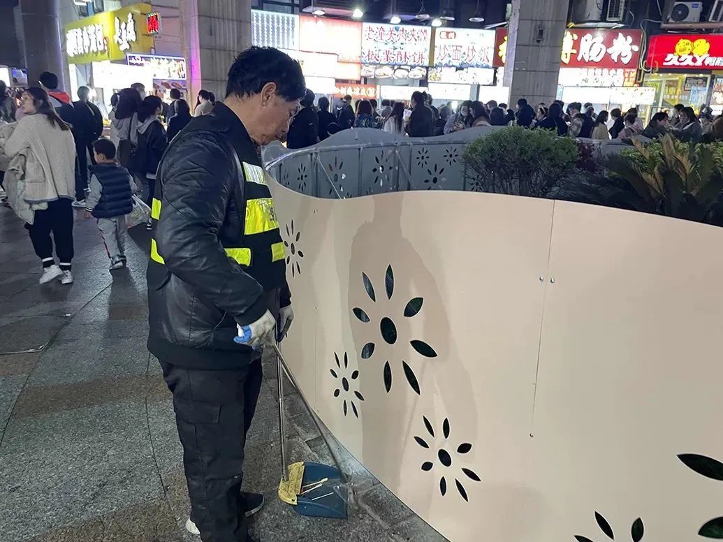 在夜市每走一会儿,就能见到保洁员在打扫。一名保洁员告诉记者,他们八九位保洁负责打扫地面上游客扔的烟头、纸屑和餐食垃圾,工作时间从下午6点到凌晨2点。