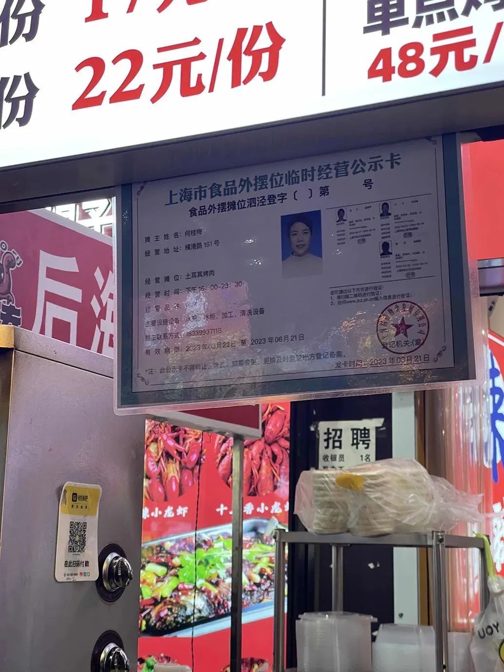 在外摆摊位上,一些摊铺上贴着上海市食品外摆位临时经营公示卡,上面注明摊主姓名、经营者照片、经营摊位品类、主要设施设备等内容,还注明此卡不得转让、涂改,如需变更、更换及时至管理方登记备案。发卡时间为2023年3月21日。