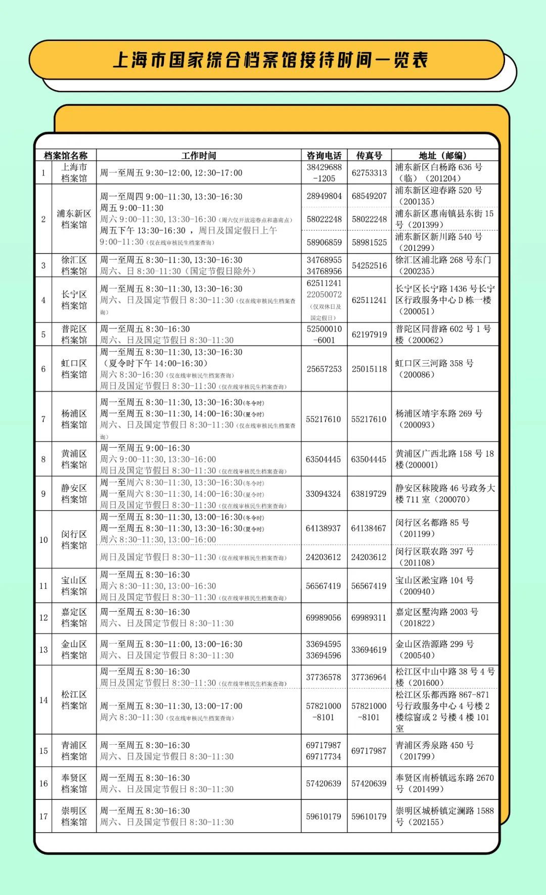 全市17家市、区综合档案馆的接待时间和联系方式详见附图。