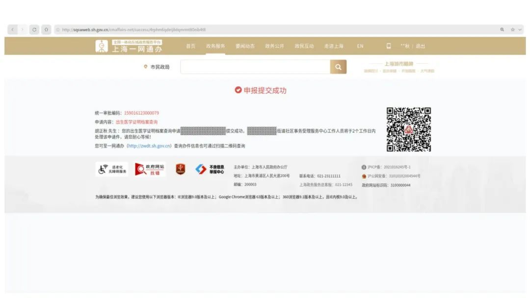 第七步:申报提交成功。相关部门工作人员将于2个工作日内处理该申请件。