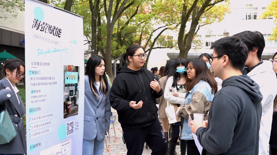 现场一展台上放着很多咖啡杯,其中,融入了梨膏糖、虎丘茶等风味的咖啡新品,吸引不少同学们前来品尝。这个已经初有成效的商业项目叫做“海萤赋能”,以品牌宣传为主要定位,通过探索“咖啡+非遗”的模式,为校园创造了更多非遗文化。