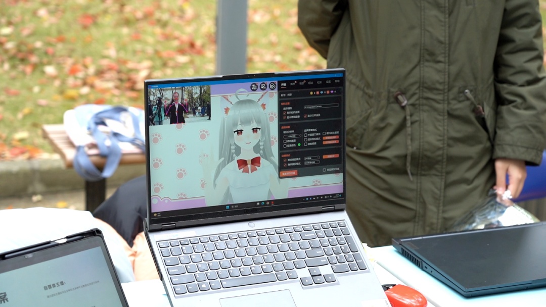 在“vup养成计划”项目组展台,电脑中一位具有交互性的虚拟主播吸引参访观众纷纷围观体验。“你可以动一下,虚拟人像也会跟着你的动作来变化。”在项目负责人张峻玮的介绍下,同学们在电脑前比划出的动作,对应出现在了虚拟人物的身上。