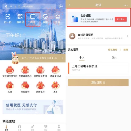 另外:市民朋友们也可以通过“随申办”微信小程序、“随申办”app、“随申办”支付宝小程序首页点击【亮证】进入,上方点击【公告提醒】相关内容前往查看消息,进行电子证照确认送达。