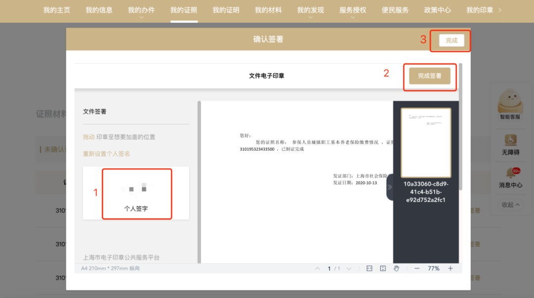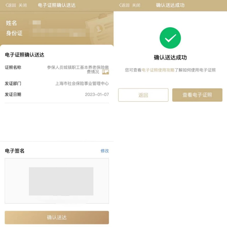 按照页面显示操作,查看证照名称、发证部门、发证日期等信息,按照提示进行电子签名,确认送达成功,还可以按照提示查看电子证照使用攻略。