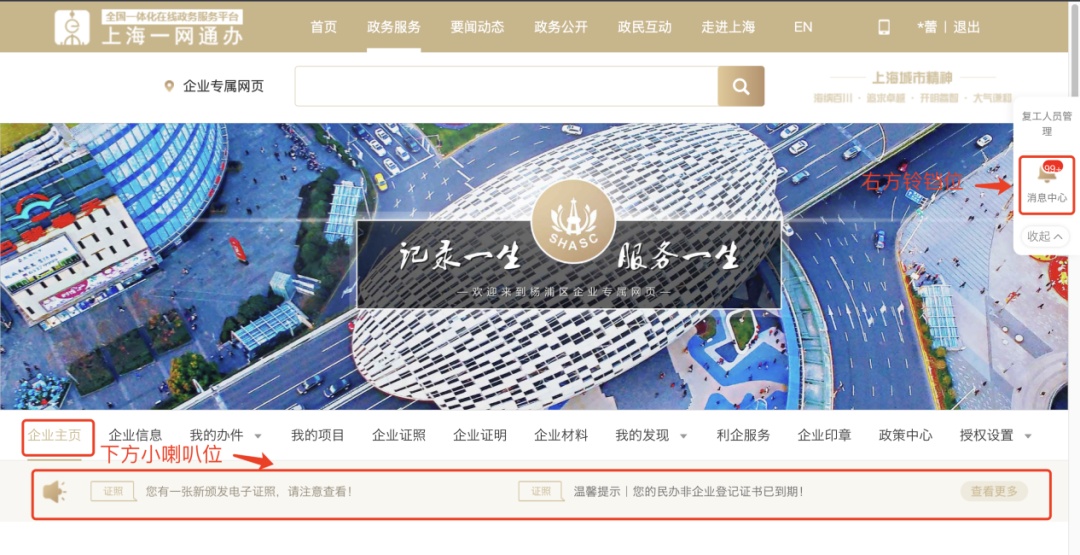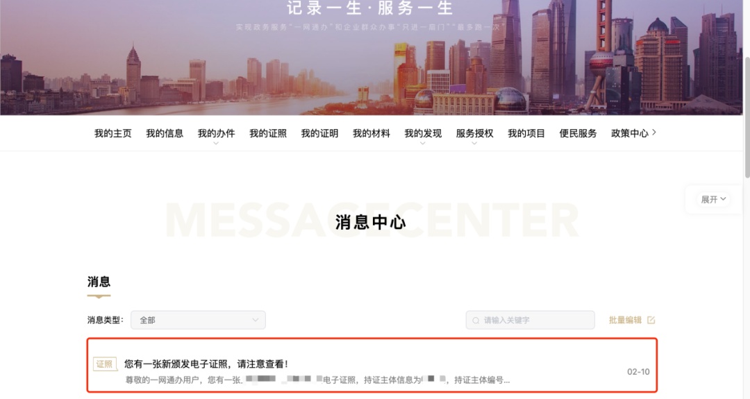 ②在市民主页或企业专属网页中进入消息中心,或通过右侧浮窗位点击进入消息中心