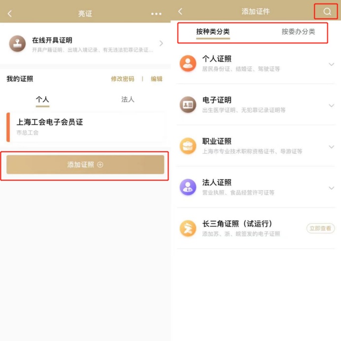 在【亮证】服务页面可自行添加证照。【亮证】页面点击【添加证照】,可以通过按委办分类或按种类分类进行查找,或输入内容搜索查找,选择相应的电子证照进行添加。