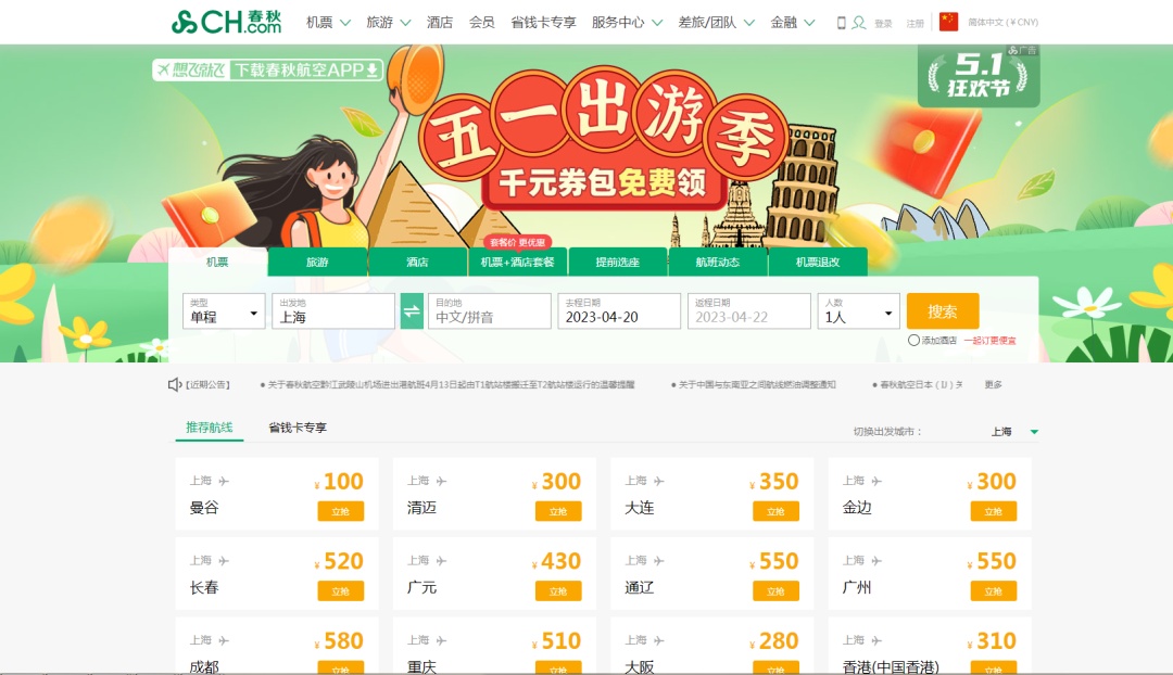 “五一”小长假即将来临,很多市民开始计划外出旅游,当前不少前往西南方向的航班已经售罄。为充分满足市民的出行需求,春秋航空宣布将三亚等热门航班更换为空客a321机型执飞,5月起还将开通深圳、杭州直飞曼谷航线,加密广州直飞曼谷航班。