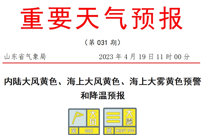 山东省气象台于4月19日11时00分发布内陆大风黄色、海上大风黄色和海上大雾黄色预警:受冷空气影响,预计20—21日我省将出现大风降温天气,部分地区有沙尘和雷阵雨。20日上午开始,自北向南逐渐转北风,渤海7—8级阵风9—10级,渤海海峡、黄海北部和中部7级阵风8—9级,大风将持续到21日。20日,德州、滨州、东营、聊城、济南、淄博、泰安、潍坊、菏泽、济宁、临沂北部、青岛北部和烟台西部南风3—4级转北风6—7级阵风8—10级,其他地区南风3—4级转北风5—6级阵风7—8级;鲁西北和鲁中地区有沙尘。