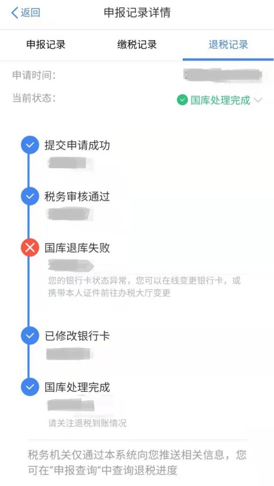 完成银行卡添加和更改后,您可以在退税记录中查询最新的退税进度,如果显示“国库处理完成”,及时关注最新退税进度,坐等收钱啦!