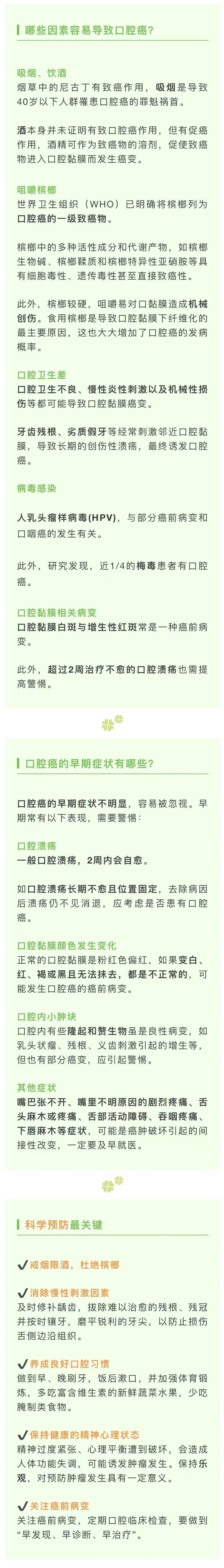 事实上,我国口腔癌并不少见,其发生率约占全身恶性肿瘤的1.75%-5.18%。据国家癌症中心统计,每年新增口腔癌病例4.81万,与口腔癌致死相关病例达2.2万。在男性患者中,口腔癌发病率已占全身恶性肿瘤发病率的第八位,对口腔癌不可掉以轻心。