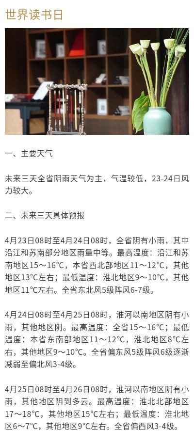 在这一波冷空气的攻势下,未来三天都是阴雨天,气温还要继续下探,“换季时降温体验卡”即将发放。未来三天全省阴雨天气为主,气温较低,23-24日风力较大。4月23日08时至4月24日08时,全省阴有小雨,其中沿江和苏南部分地区雨量中等。最高温度:沿江和苏南地区15~16℃,本省西北部地区11~12℃,其他地区13℃左右;最低温度:淮北地区9~10℃,其他地区11℃左右。全省东北风5级阵风6-7级。
