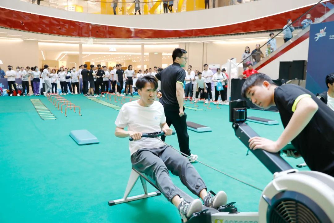 现场,随着主持人一声令下,第一组选手便迅速投身于比赛项目当中。绳梯跨栏、踏板横跳、划船机、战绳大甩……选手们连续通过8个关卡,充分展现着各自的心肺耐力、上下肢力量、身体协调性等能力。