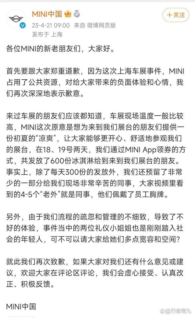 同是21日早上9点,mini中国在其官方微博发文称吃冰淇淋的老外都是工作人员,两位礼仪小姐也是刚踏入社会的年轻人,可不可以给她们点宽容和空间?