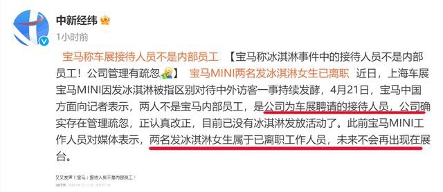 4月19日,宝马mini在2023第二十届上海国际汽车工业展览会出现“冰淇淋”风波后,热度不减,展台两位女服务员的“命运”颇让人关注。