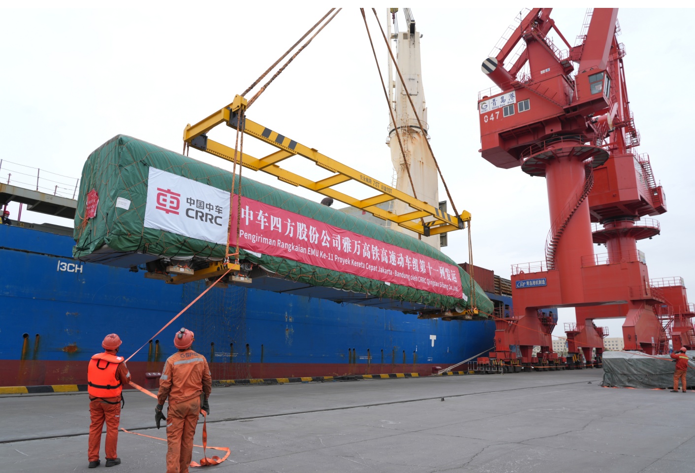 4月26日,中车四方股份公司制造的我国出口印尼雅万高铁第11列高速动车组在青岛港顺利装船启运,通过海运发往印尼,这是雅万高铁项目最后一批发运列车,标志着我国出口国外高铁列车第一单全部完成发运。