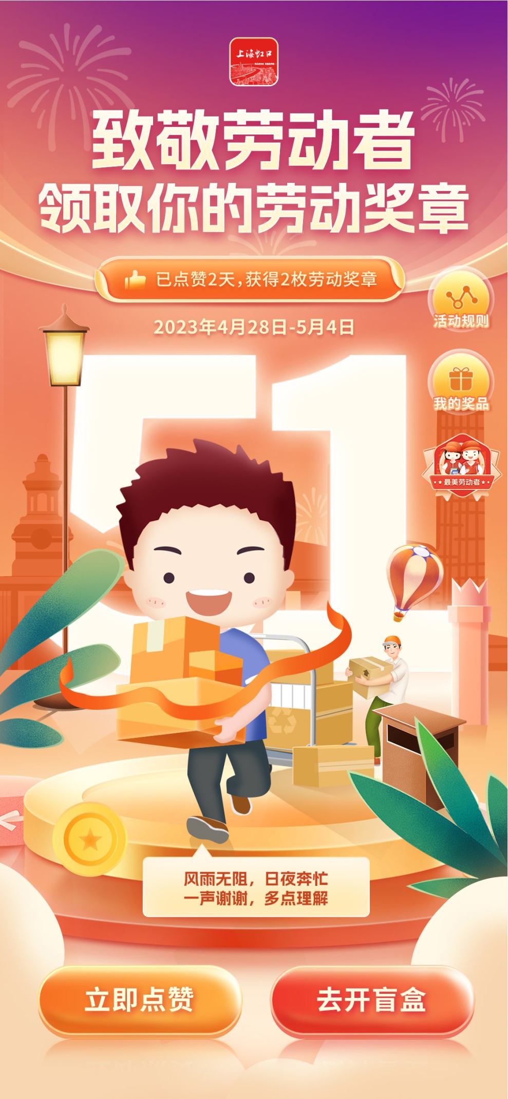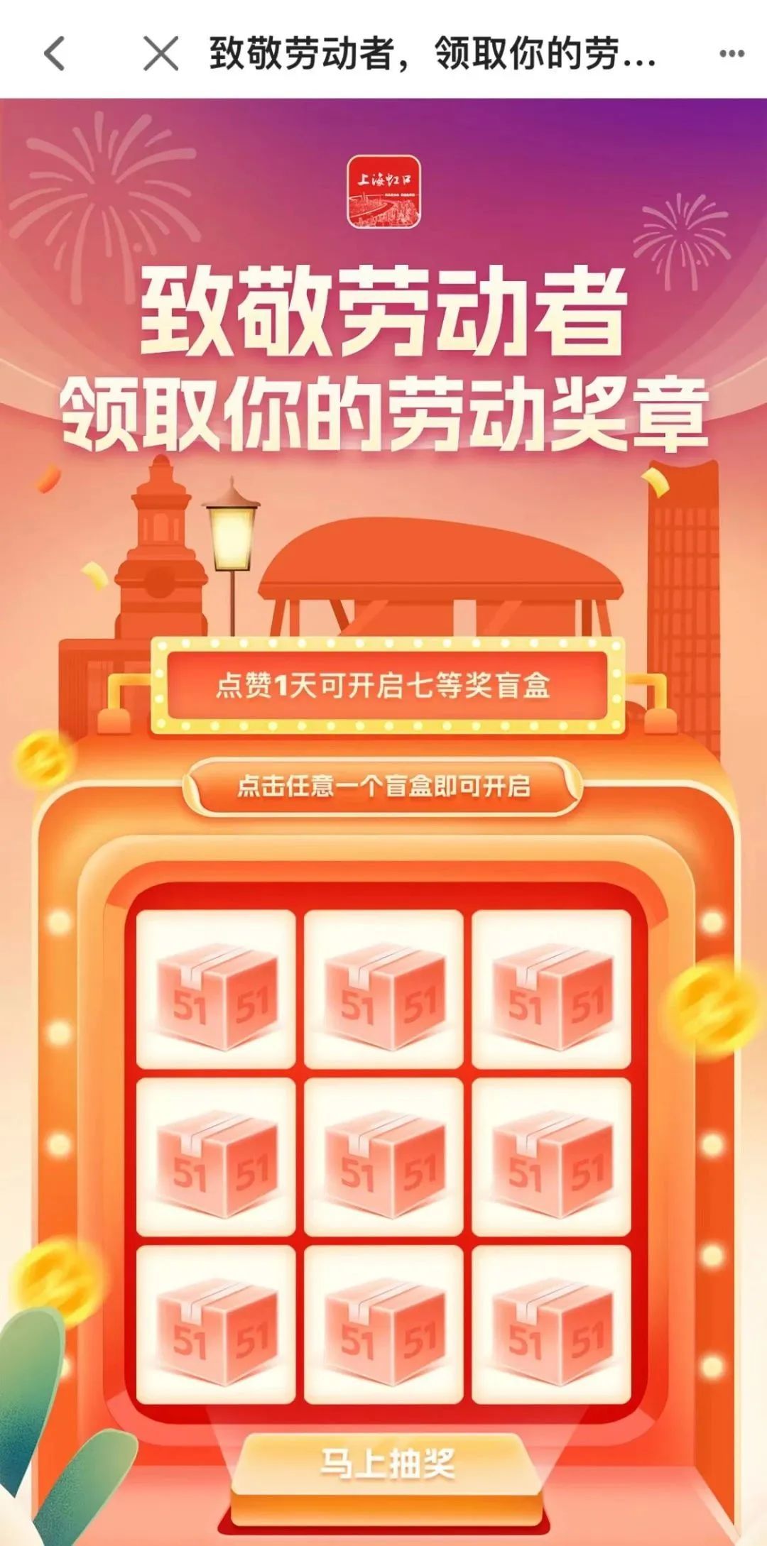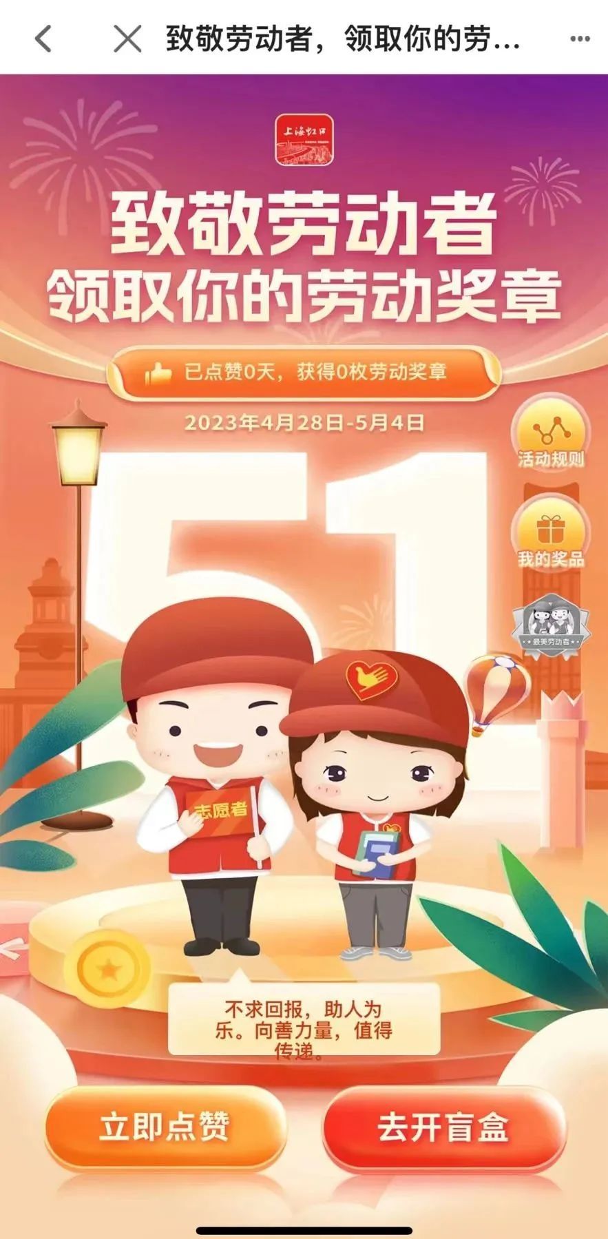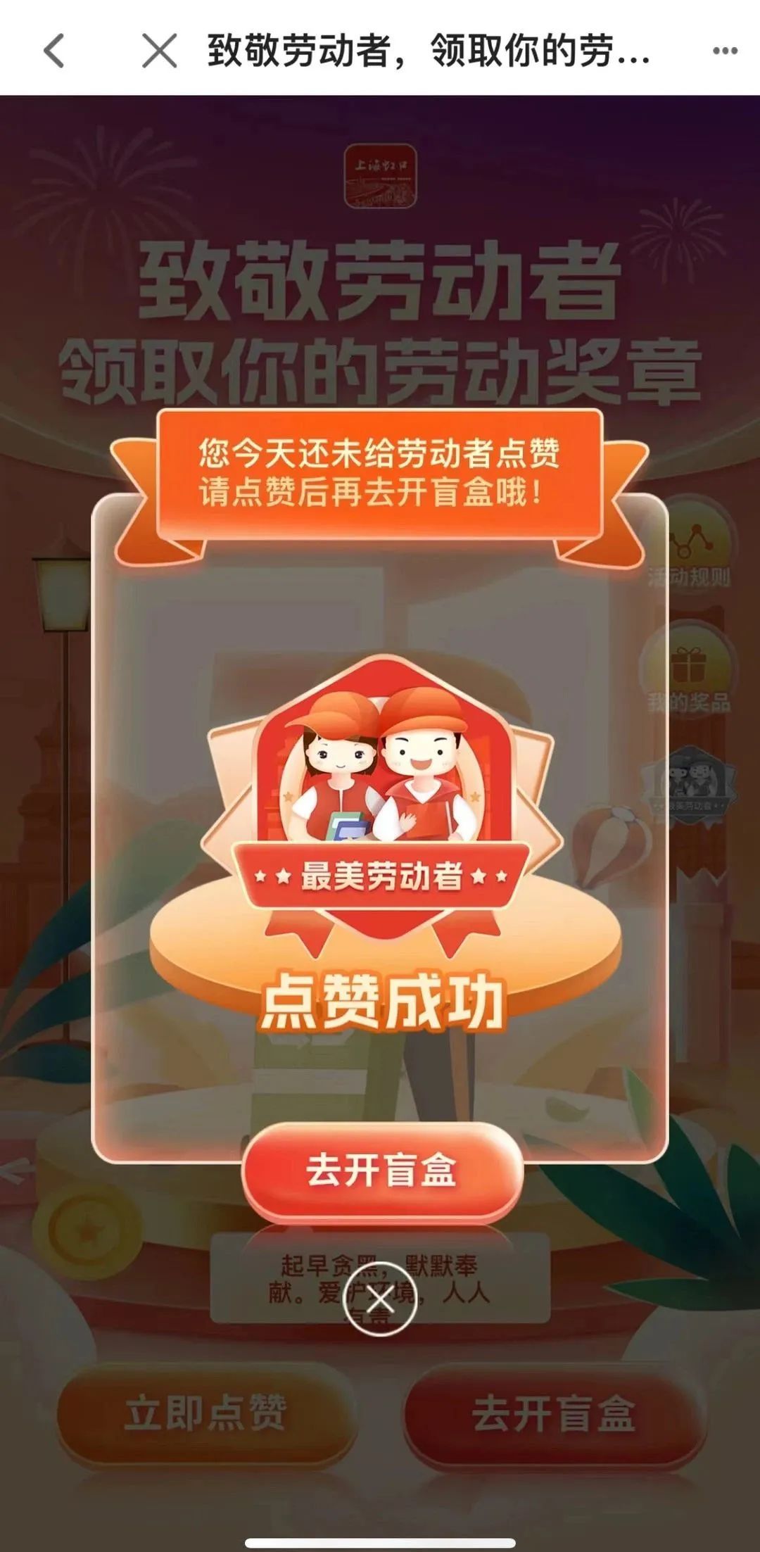每名用户每天可点赞1次并获得1枚劳动奖章,点赞成功后选择开启1个盲盒参与抽奖;连续点赞7天,将会自动点亮首页的“最美劳动者”徽章。