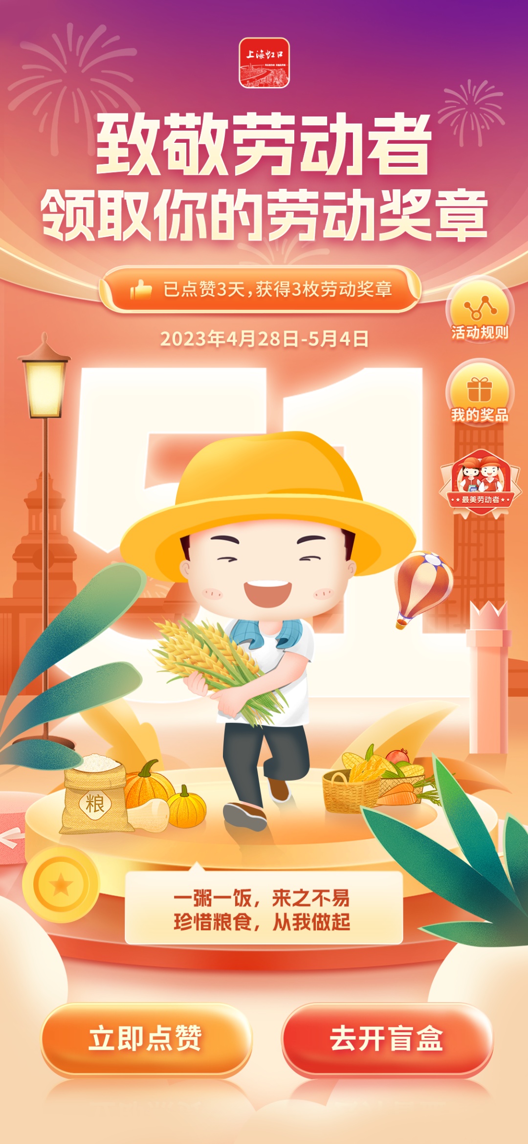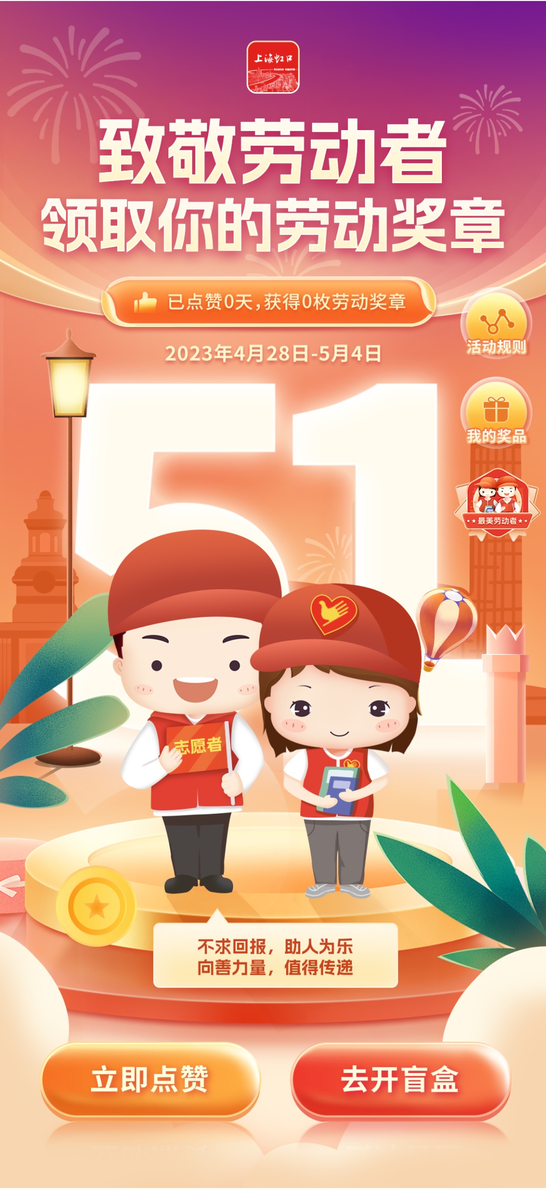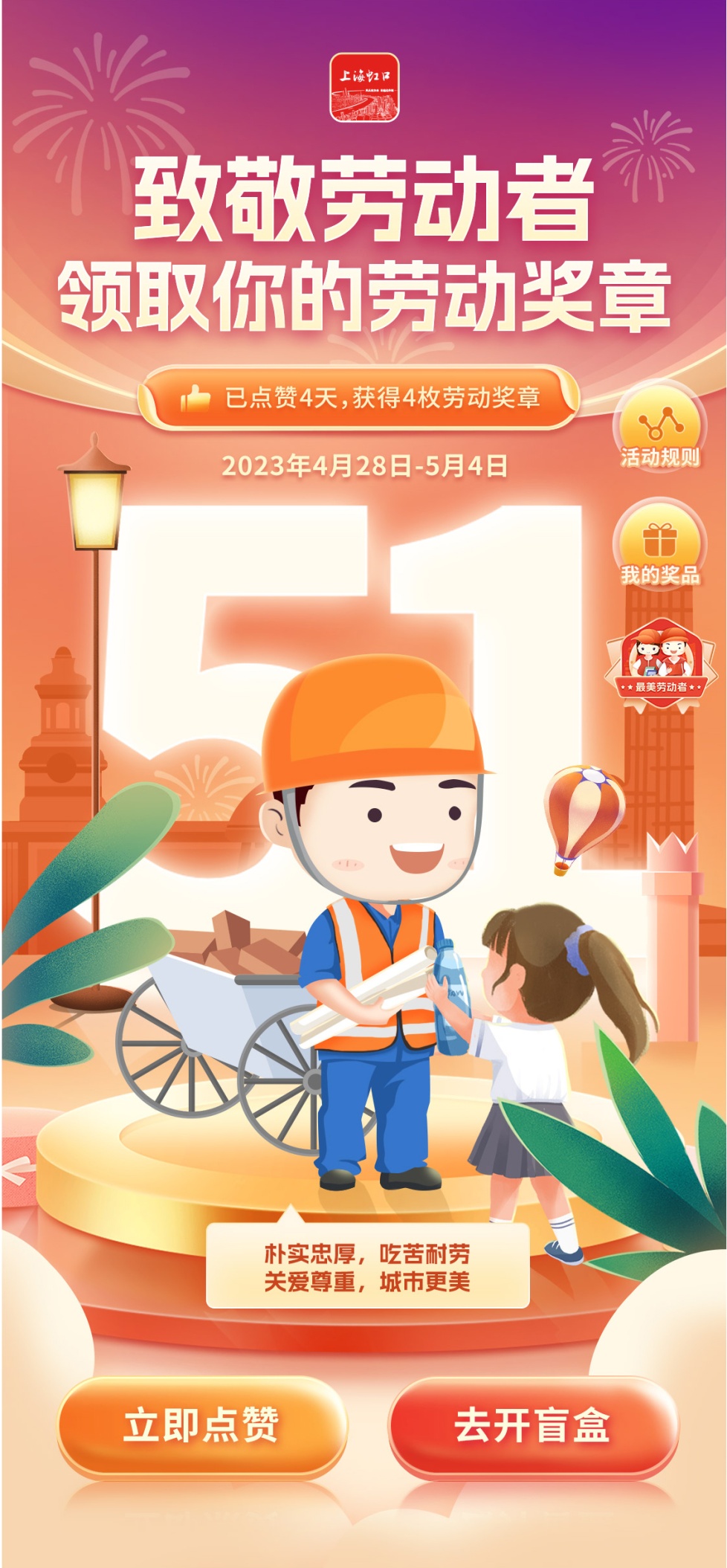 每名用户每天可点赞1次并获得1枚劳动奖章,点赞成功后选择开启1个盲盒参与抽奖;连续点赞7天,将会自动点亮首页的“最美劳动者”徽章。