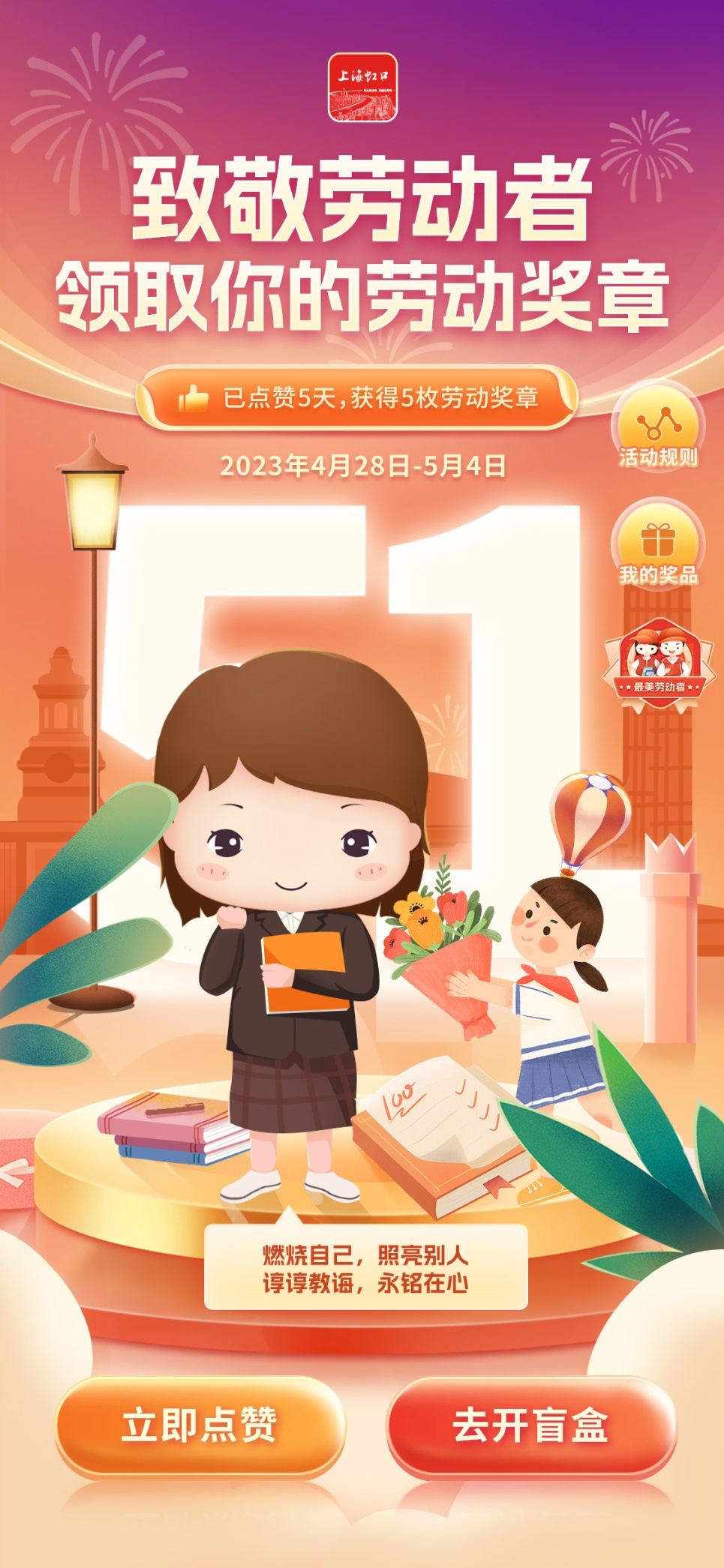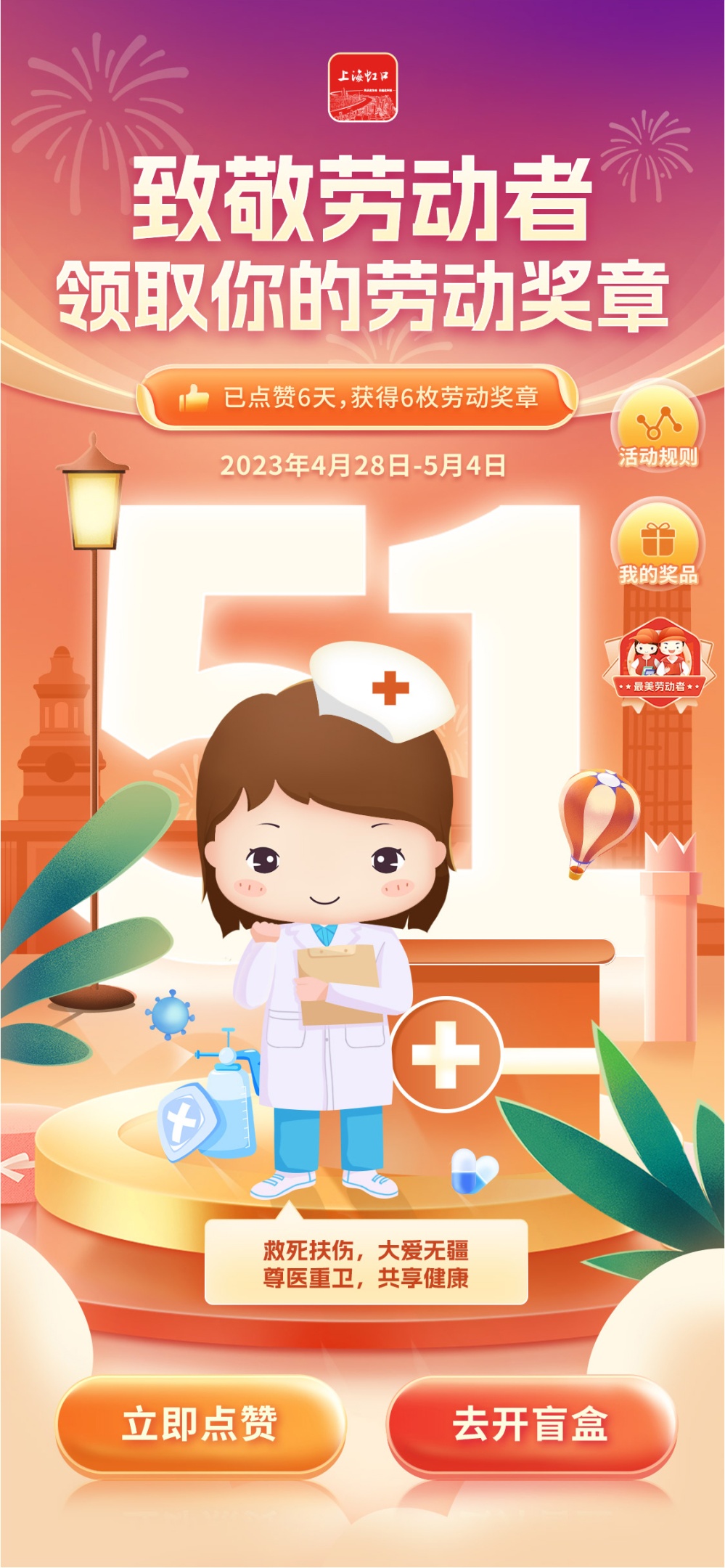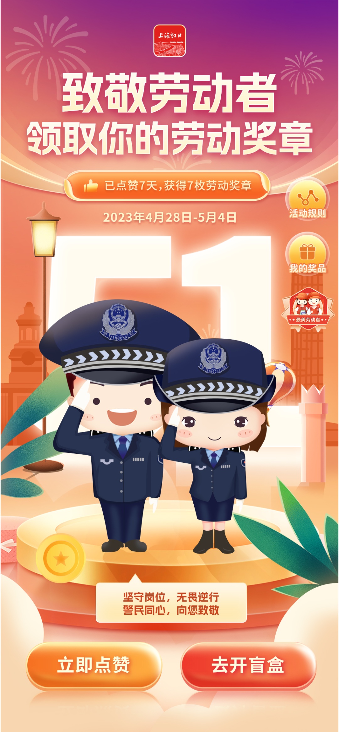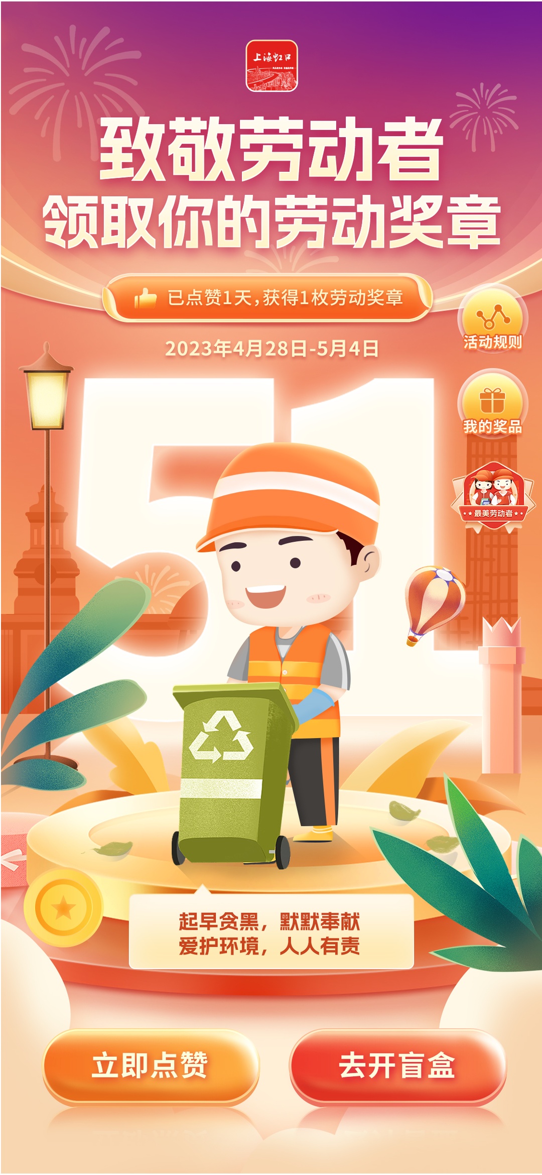每名用户每天可点赞1次并获得1枚劳动奖章,点赞成功后选择开启1个盲盒参与抽奖;连续点赞7天,将会自动点亮首页的“最美劳动者”徽章。