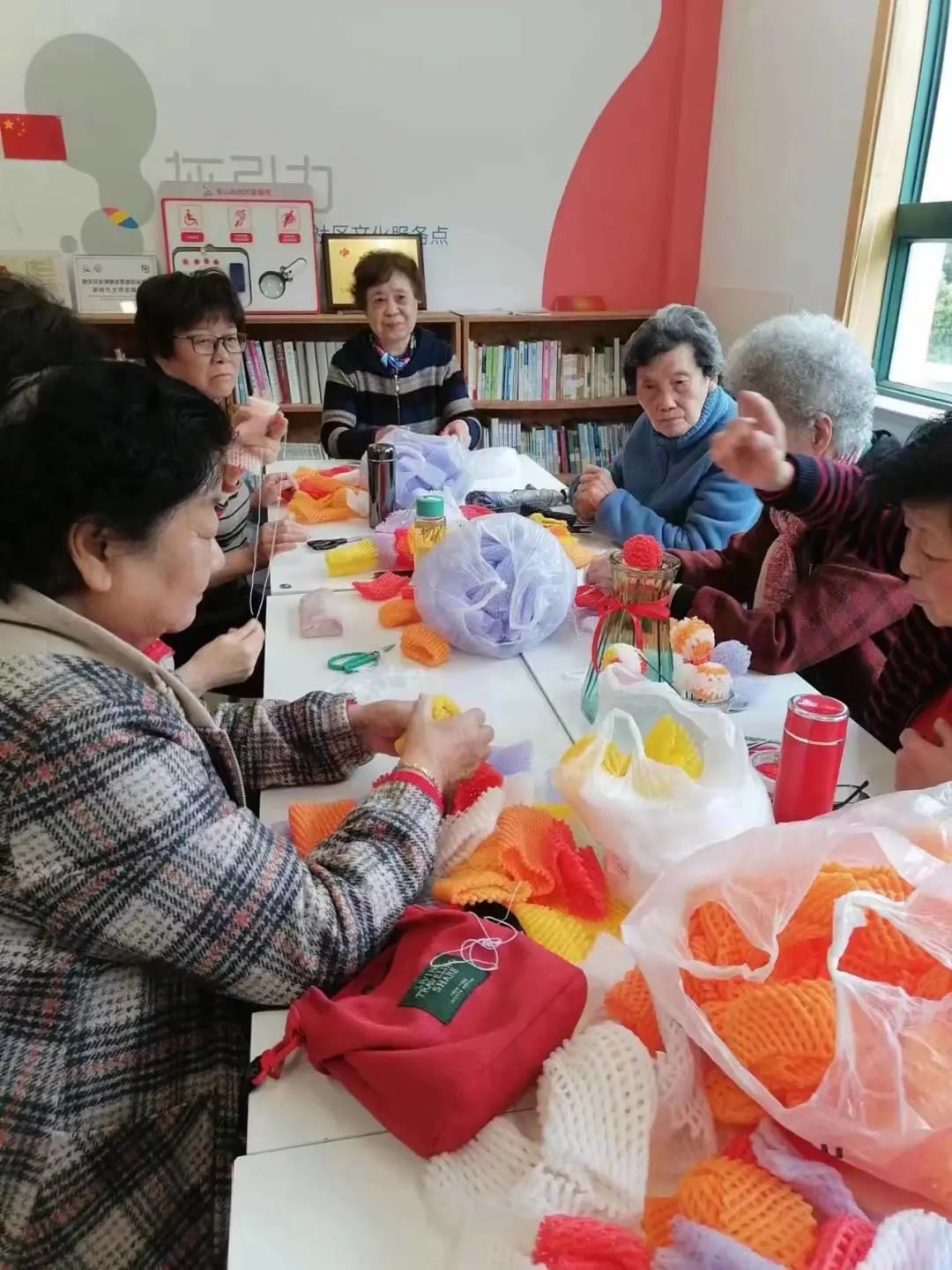 很多水果在销售时有一层泡沫网套的“外衣”,这些泡沫网套往往会被人们随手丢弃。近日,彭浦镇美景雅园居民区教师联谊会的退休老师们通过参加手工活动,将泡沫网套制作成网兜花,实现了废物再利用。