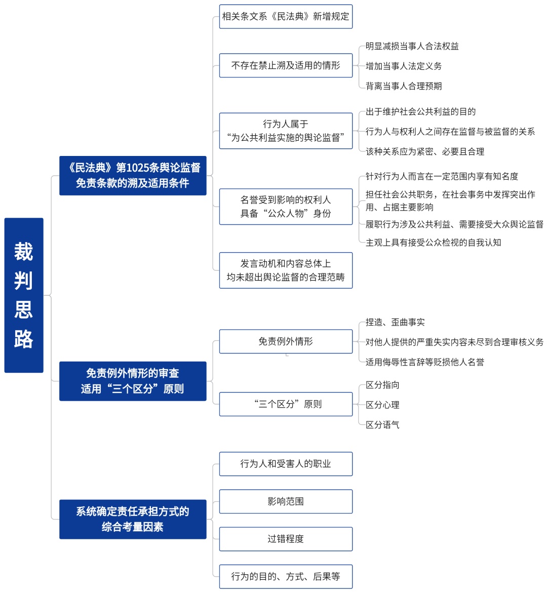 鉴于本案涉诉29项被控侵权言论均发表于2020年5月至10月期间,系《民法典》施行前的法律事实引起的民事纠纷。类似案件是否溯及适用《民法典》新增规定第1025条,应当结合《最高人民法院关于适用〈中华人民共和国民法典〉时间效力的若干规定》第3条之规定,审查是否存在禁止溯及适用的情形、行为人是否属于“为公共利益实施的舆论监督”、权利人是否具有“公众人物”身份以及发言动机和内容总体上是否明显超出了舆论监督的合理范畴等。