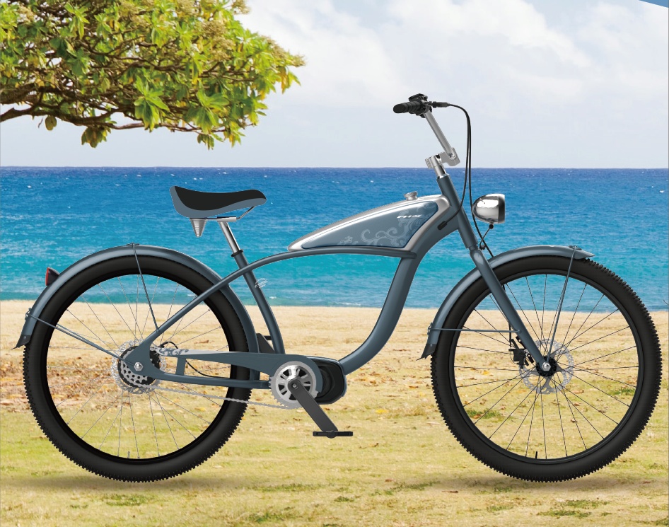 凤凰c6-pro哈雷锂电自行车的设计意向来源于复古哈雷摩托车,简化出充满张力、运动感的线条给人一种大气感,陡峭倾斜的上管使车架显得动感十足。车架上管上面配备油箱电池,将摩托车油箱改为电池盒,保留其复古外形,并将油箱盖设计为钥匙口,把“熟悉产品陌生化”的创新设计理念应用到此车,进而提升设计感。车架下管以及中管均采用优美曲线,使整车保持运动感调性的同时又不失优雅感。车架前置复古大灯,与整车设计相呼应,增加设计亮点。尺寸加大的座垫,让整车更具哈雷摩托车的厚重感及舒适感。
