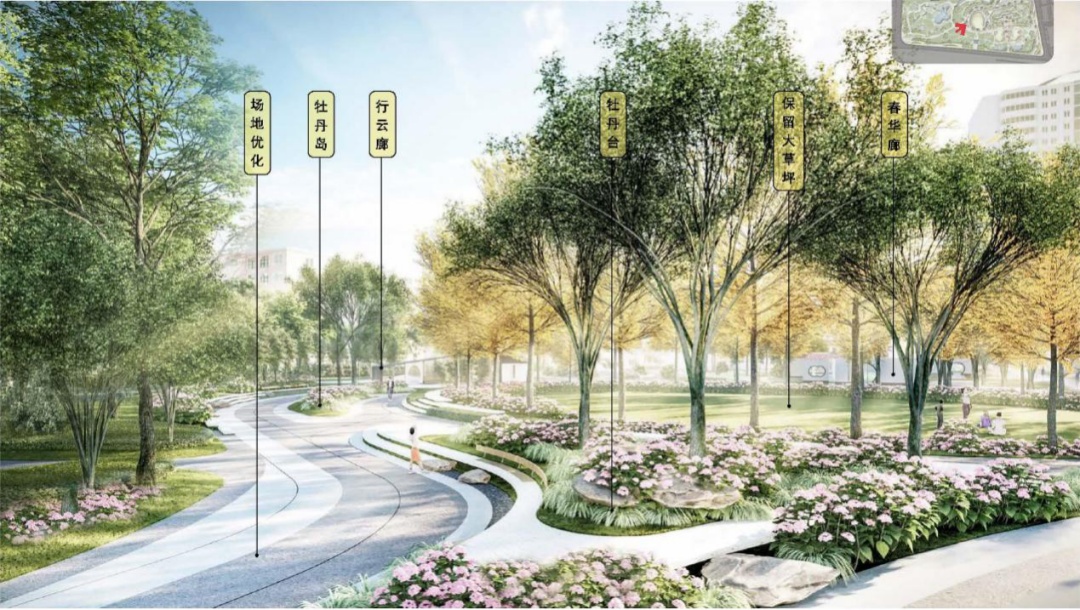 漕溪公园融入街区的开放形象,实行三个城市界面三种开放策略:结合现状优化;围墙退界软化边界;梳理打造整洁城市形象。从照明、监控、管理三个方面进行基础设施提升与优化,营造安全、舒适的城市绿色空间,并实施24小时开放使用。在融入街区的过程中,展现园林风貌、强化既有花卉特色,让漕溪公园成为徐汇乃至上海的公园城市名片。