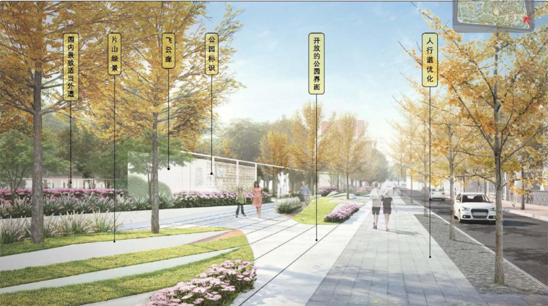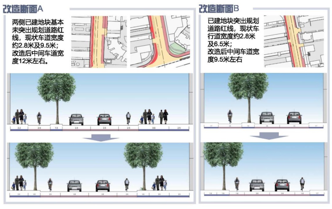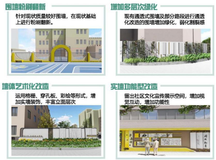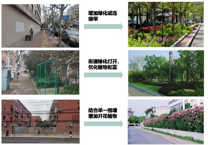一是活化消极界面,增加建筑实墙功能性,对实体围墙增绿补绿,打造有生机的街道界面。二是进一步提升步行品质,保障人行道通行宽度,增加无障碍坡道,打造步行友好的街道空间。三是协调立面店招,美化建筑立面,规范底商店招,形成整体协调、兼顾个性的底商界面。四是丰富绿化配置,营造节点主题,沿街补充花木,确保街道四季有花可观、有景可赏。