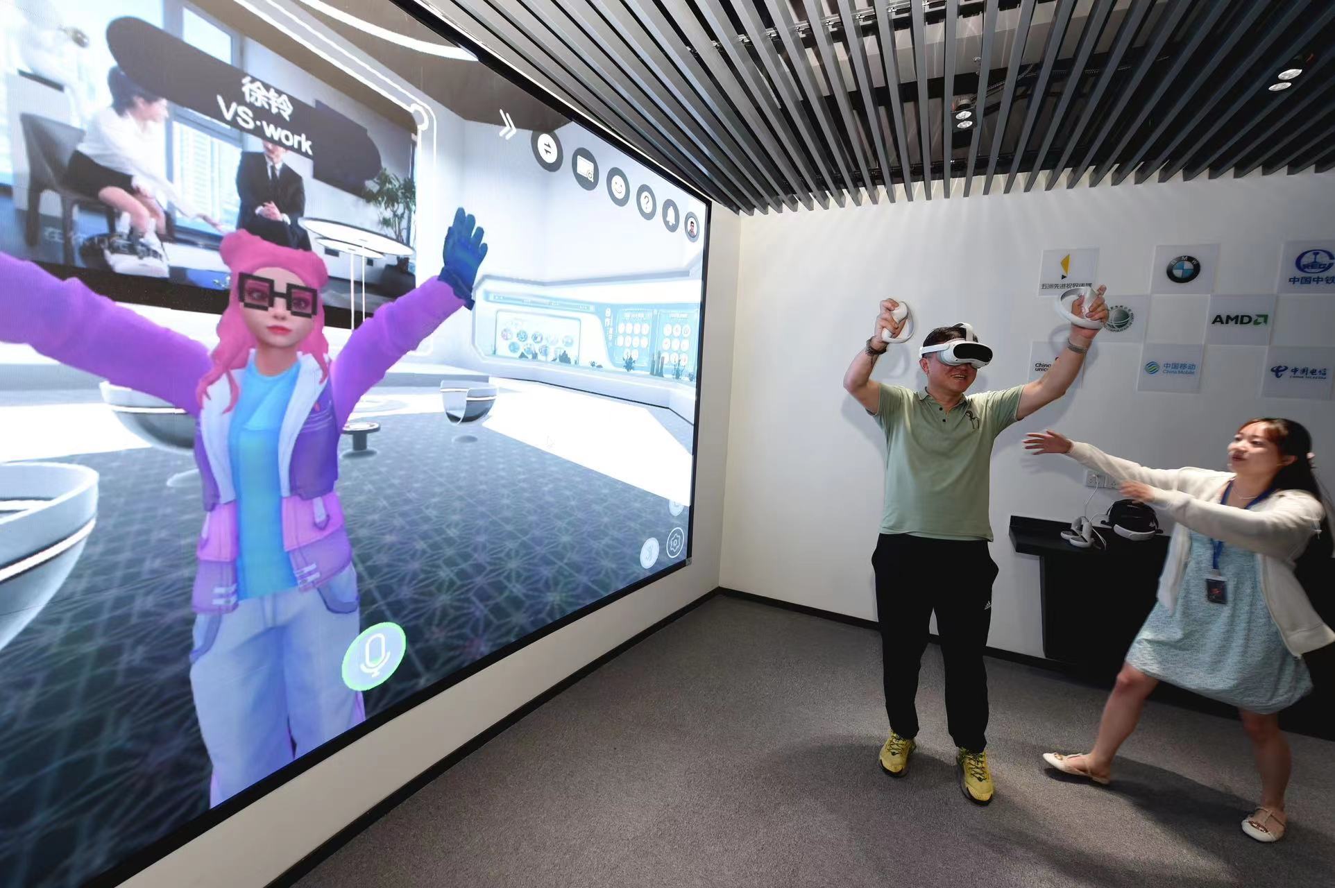 在维赛客的展厅内,体验者只需穿戴好头显和手柄,就可以操纵3d虚拟人物漫步元宇宙中。维赛客的vs·work元宇宙引擎作为一个互联协作的元宇宙底层平台,轻松打破时间和空间的限制,让全球不同时空的用户共享元宇宙互联万物的能力,已获得业内外广泛认可,为政府部门、腾讯、阿里、字节跳动等多领域头部机构提供元宇宙解决方案。