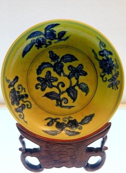 南京博物院收藏的“黄地青花花卉纹盘”也是正德年间的瓷器。盘子的中心绘有缠枝纹,以植物的枝杆或蔓藤作骨架,向上下、左右延伸,不仅蜿蜒多姿,优美生动,而且因为结构连绵不断,有生生不息、万代绵长的寓意。盘的四周内壁上绘有葡萄、荷花、石榴、柿子四式祥花瑞果,外壁上绘有缠枝茶花。