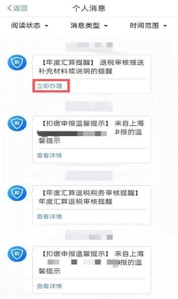 答:您打开个税app,首页右上角消息图标,点开查看“【年度汇算提醒】退税审核报送补充材料或说明的提醒”,点击下方“立即办理”。