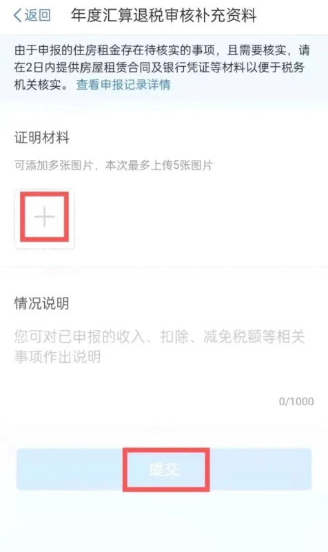 进入“年度汇算退税审核补充资料”界面,根据上方文字提示确认需要提交的材料,点击下方的“+”上传证明材料。