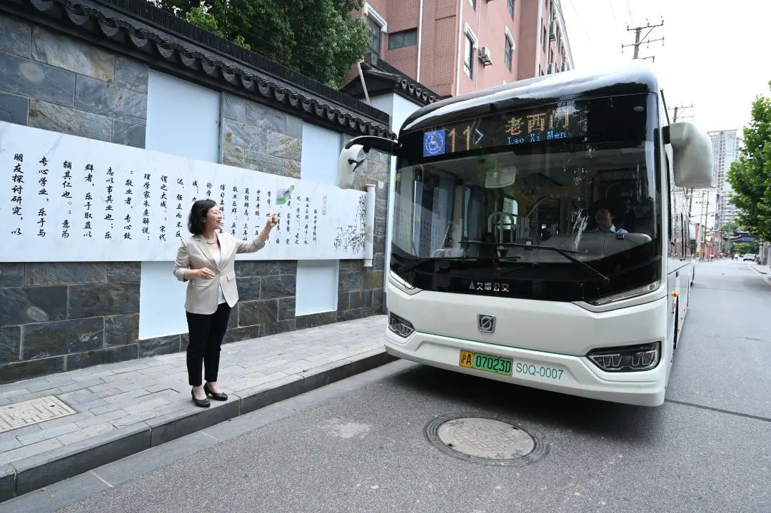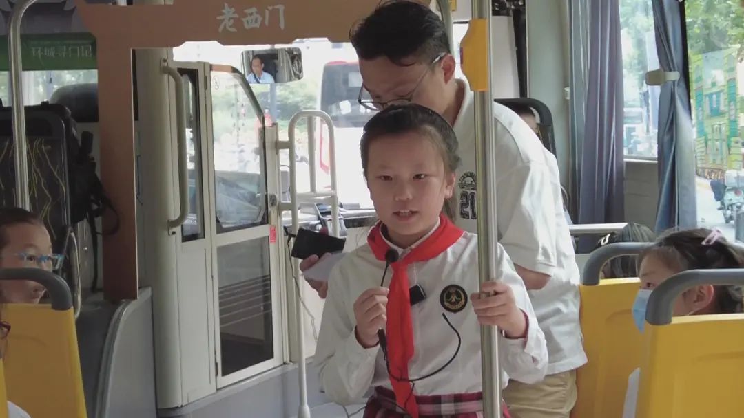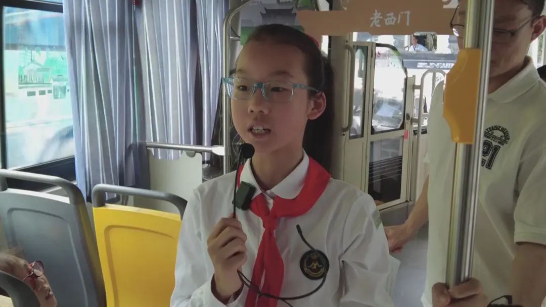 在行驶中的公交车上,每到一站,就会有一名来自上师大附属梅溪小学的小小“讲解员”用沪语或普通话对附近的地标古迹进行讲解,稍显稚嫩且紧张的脸庞下,是掩盖不住的认真和使命感。此前,大家都通过网上查阅资料、与老师研讨等方式,为自己写下讲解稿,过程中,大家对老城厢的历史又有了更深入的了解。
